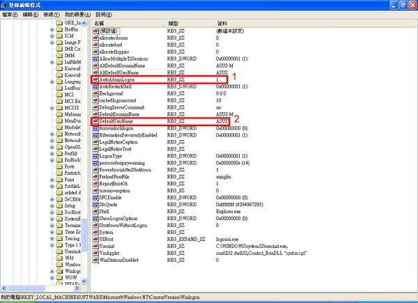 Step 6 尋找"DefaultUserName"並改為你要自動登入的使用者名稱(本例為ASUS)